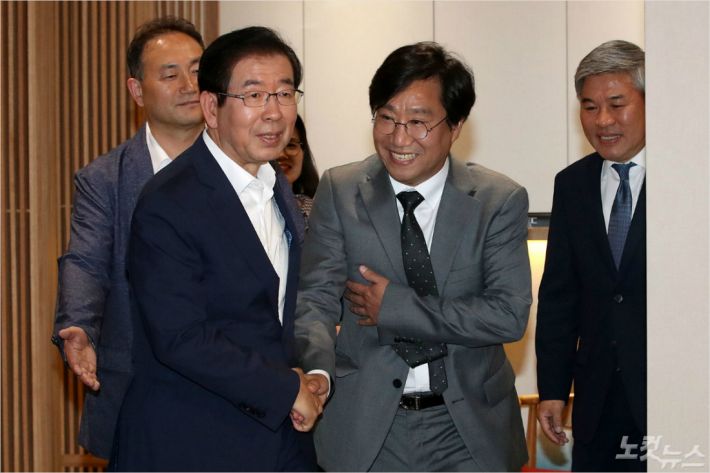 박원순 서울시장과 양정철 민주연구원장이 3일오후 서울 시청에서 서울시 산하 서울연구원과 민주당 산하 민주연구원의 공동연구협약에 앞서 만나 악수를 하고 있다. 윤창원기자