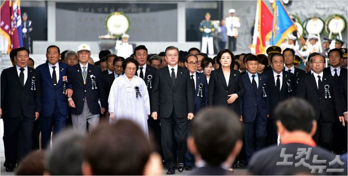 문재인 대통령과 김정숙 여사, 여야 대표를 비롯한 내빈들이 6일 오전 동작구 국립서울현충원에서 열린 제64회 현충일 추념식에서 현충탑 참배를 마치고 이동하고 있다. (사진=윤창원 기자)