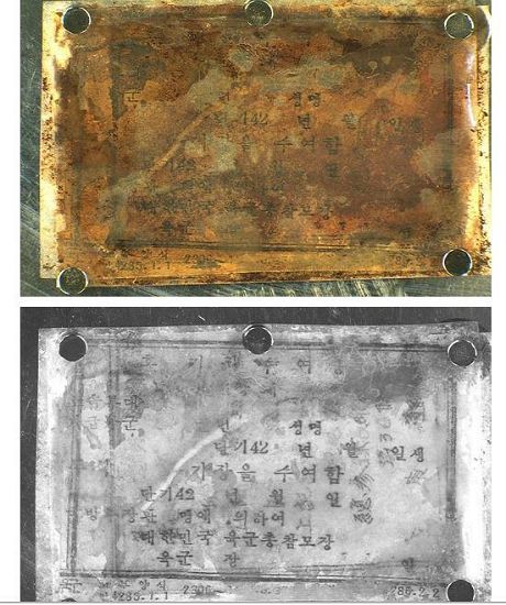 발견된 기장 수여증에는 소속부대, 계급, 군번, 성명 등의 기입란이 있지만 글씨가 지워져 육안으로는 식별이 어렵다.