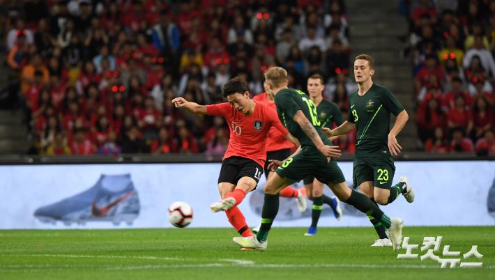 7일 오후 부산 아시아드 주경기장에서 열린 축구국가대표팀 대한민국대 호주 A매치 평가전 후반 경기에서 이재성이 패스를 하고 있다.