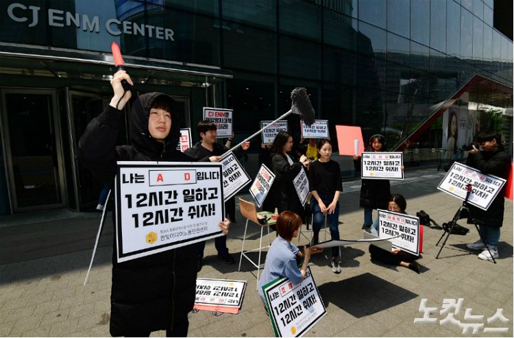 지난 4월 10일 오전 서울 중구 서울지방고용노동청 앞에서 열린 '해외촬영 연속 151시간, 턴키계약 관행 여전' 스튜디오드래곤 제작 아스달연대기 고발 기자회견 참석자들이 규탄 발언을 하고 있다. (사진=황진환 기자)