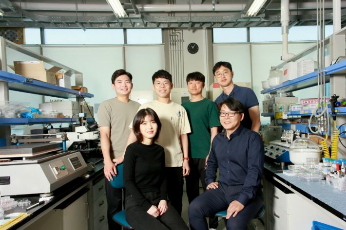 우측 상단부터 김진영 연구원, 이영오 연구원, 조승세 연구원, 박종화 연구원, 고현협 교수, 명진영 연구원.(사진=UNIST 제공)