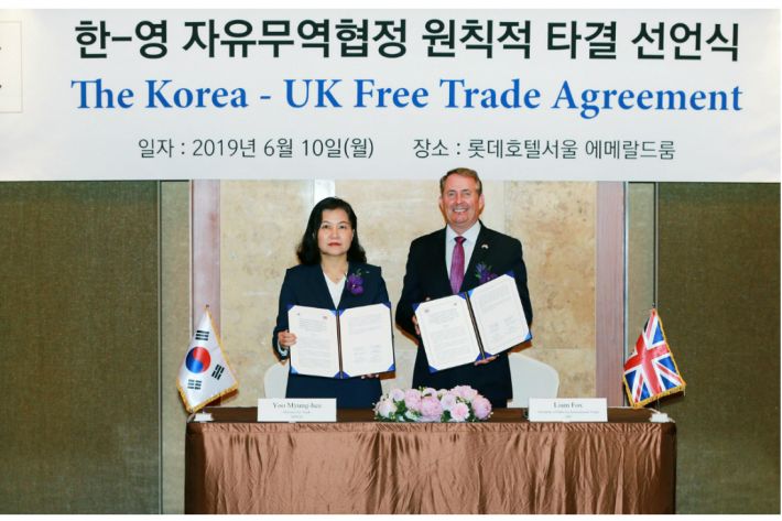 EU에서 두 번째로 큰 교역 상대국인 영국은 현재 한·EU FTA의 적용을 받지만 최악의 경우인 노딜 브렉시트(Brexit·영국의 EU 탈퇴)가 일어나더라도 그로 인한 통상 공백을 미리 차단하는 셈이다.