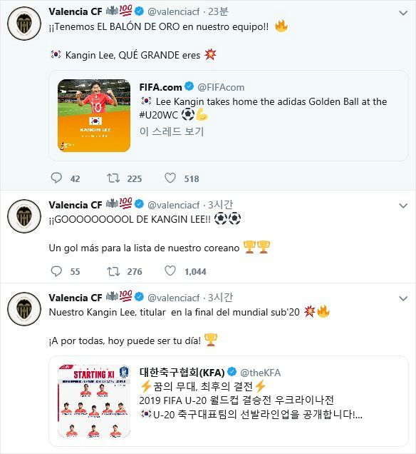 특히 골든볼 수상 소식을 전하며 이강인이 발렌시아 소속이라는 점을 기뻐하는 게시글을 덧붙였다.