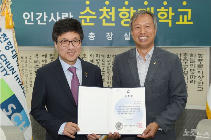 20일 오전 교내 대학본관 총장 접견실에서 지난 5월 ‘제72회 세계적십자의 날’을 맞아 보건복지부장관상을 수상한 스포츠과학과 이광수 교수(오른쪽)에게 서교일 총장이 표창장을 전수하며 축하하고 있다. (사진=순천향대 제공)