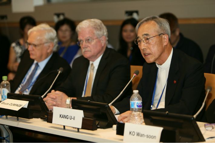 21일 오전(한국시간) 미국 뉴욕 유엔에서 열린 제주4.3 인권 심포지엄에서 강우일 주교(오른쪽)가 기조발표를 하고 있다. (사진=제주4.3평화재단 제공)
