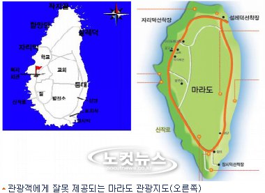 <사진 왼쪽이 바른 지도다.>사진>모슬포항 내 마라도 여객선 대합실에 비치된 마라도 관광지도 역시 지형이 바뀌었다.