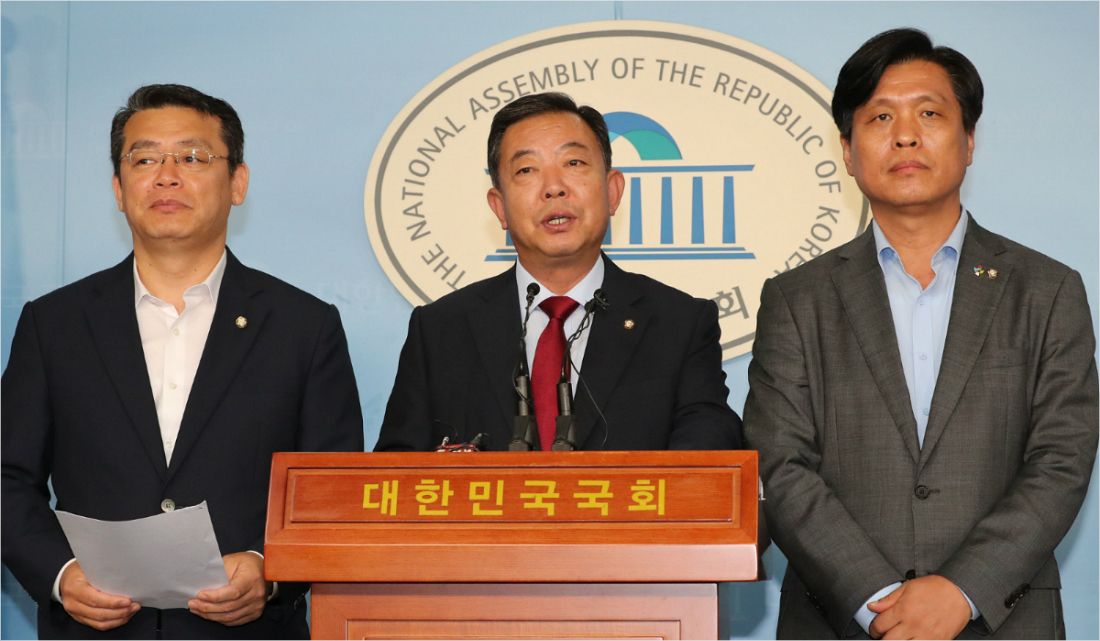 이찬열 국회 교육위원장(가운데)과 민주당 간사인 조승래 의원(오른쪽), 바른미래당 간사인 임재훈 의원이 24일 오전 국회 정론관에서 '유치원3법 교육위 처리 불발' 관련 기자회견을 하고 있다.(사진=연합뉴스)