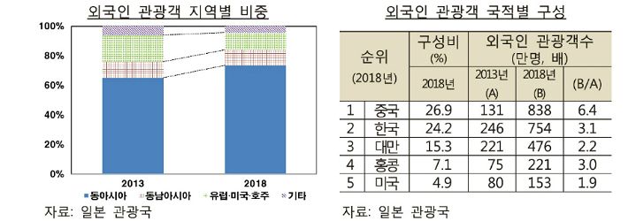 외국인 관광객의 행태는 개인관광·지방관광, 문화체험이 늘어나는 쪽으로 변화한 것으로 분석됐다. 2013년 대비 지난해 외국인 관광객의 개인관광 비중은 17.1%p 증가했고, 도쿄·오사카·교토 등 3대 도시권을 제외한 지역의 숙박일수도 2배 이상 증가했다. 소비양상은 식음료·오락 등 문화체험 중심으로 변화해 1인당 소비액은 10만엔대 중반에서 정체됐다.