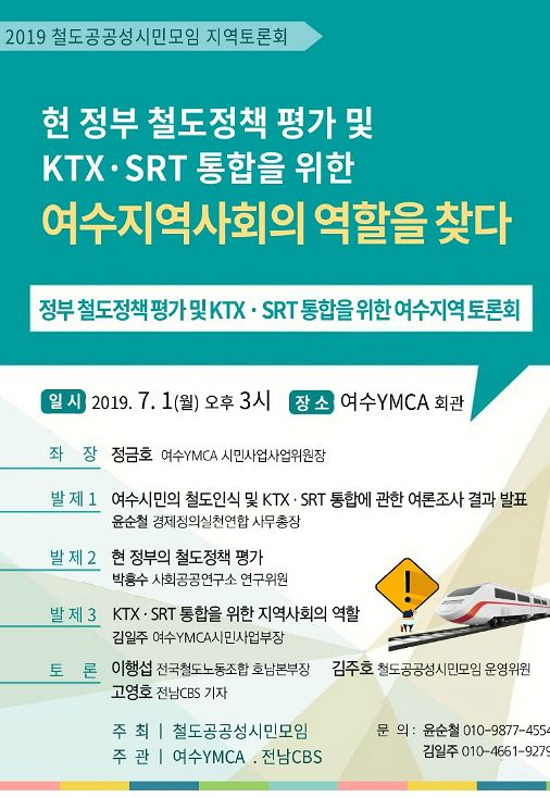 '철도공공성시민모임'이 주최하는 '정부 철도정책 평가 및 KTX·SRT 통합 위한 여수지역 토론회'가 7월 1일 오후 3시 광무동 여수YMCA 회관 2층 강당에서 열린다.