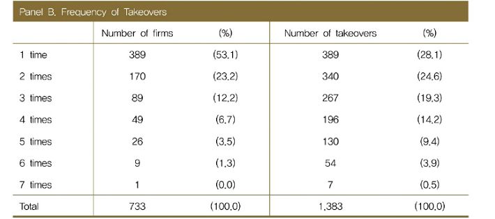 이 기간 733개 기업이 다른 회사에 인수됐으며, 전체 인수회수(빈도)는 1383에 달하는 것으로 나타났다. 6번 주인이 바뀐 기업이 9곳, 7번 바뀐 기업 1곳 등을 모두 감안한 수치다.