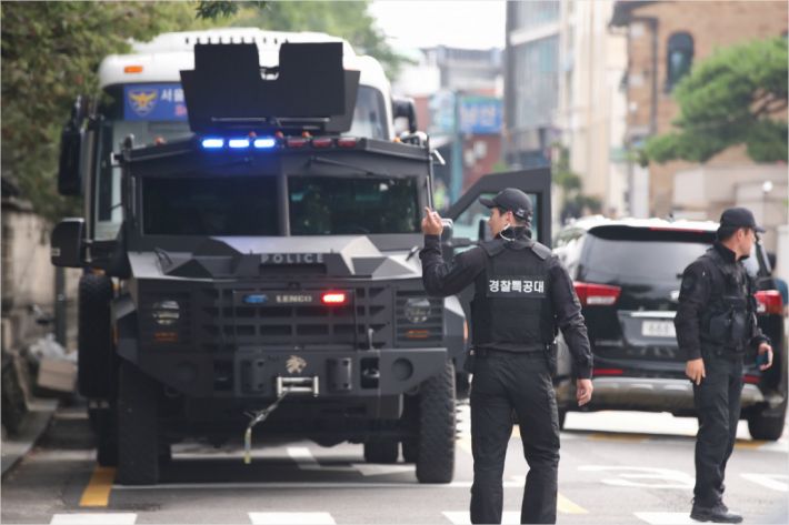 29일 방한하는 도널드 트럼프 미국 대통령의 숙소로 알려진 서울 용산구 그랜드하얏트호텔에 경찰특공대가 경비근무를 하고 있다. (사진=연합뉴스)
