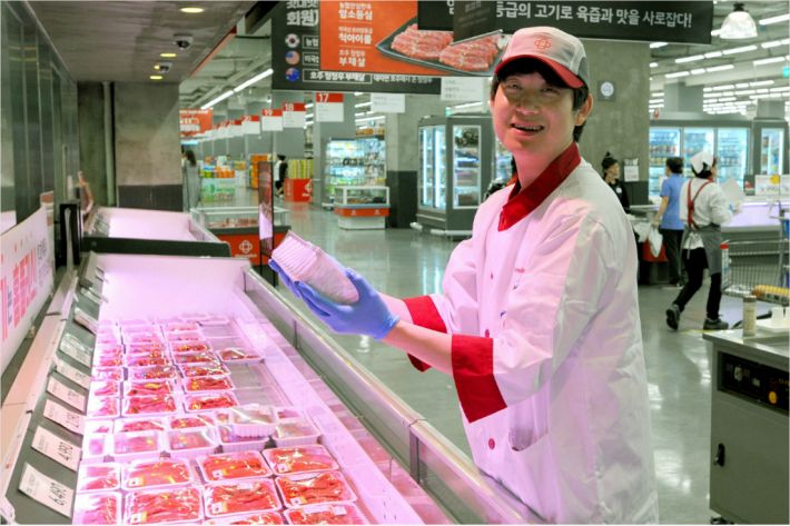 1일 정규직 직급인 '선임'으로 발령된 강성태 홈플러스목동점 선임(31)이 홈플러스 스페셜 목동점에서 축산 상품을 진열하고 있다. (사진=홈플러스 제공)