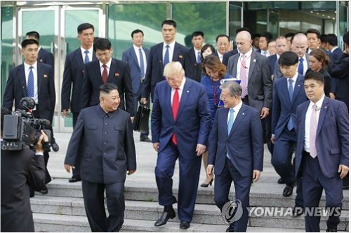 도널드 트럼프 미국 대통령, 김정은 북한 국무위원장이 30일 오후 판문점 남측 자유의 집에서 회동을 마친 뒤 문재인 대통령과 함께 군사분계선으로 이동하고 있다.(사진=연합뉴스 제공)