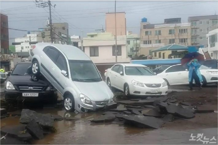 그 결과 제주시 용담동에 있는 한천이 범람하면서 복개구조물 위 주차장에 있던 차량이 침수되는 사고가 발생했습니다.