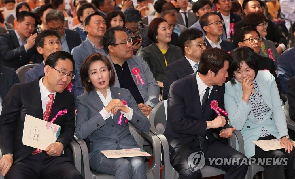 부처님오신날인 지난 5월 12일 오전 서울 종로구 조계사에서 열린 봉축법요식에서 정의당 이정미 대표(오른쪽부터), 더불어민주당 이인영 원내대표, 자유한국당 나경원 원내대표, 주호영 의원이 이야기를 하고 있다. (사진=연합뉴스)