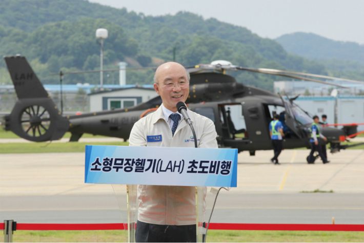 KAI 김조원 사장이 LAH 초도비행 기념사를 하고있다.(사진=KAI 제공)