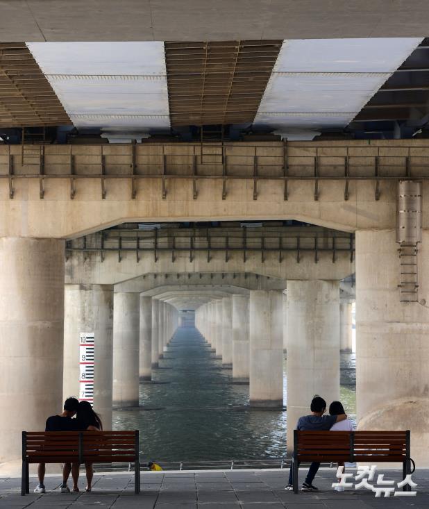 서울과 경기, 강원 일부 지역에 폭염경보가 내려진 5일 오후 서울 여의도 한강공원을 찾은 시민들이 마포대교 아래에서 더위를 피하고 있다.