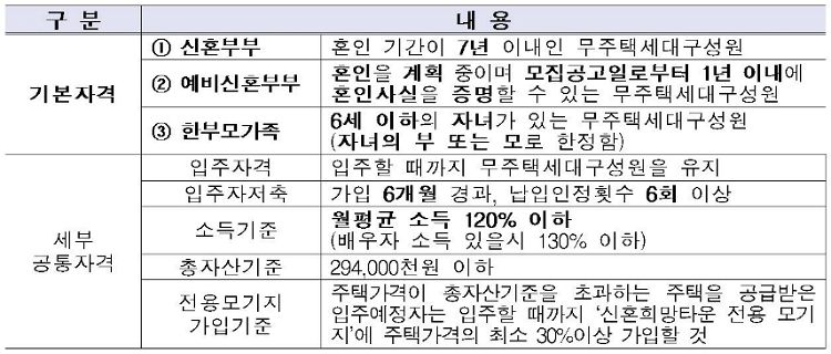 입주자격은 △혼인기간 7년이내인 신혼부부 △혼인을 계획중인 예비신혼부부 △6세이하 자녀가 있는 한부모 가족중 월평균소득 120%(맞벌이는 130%)에 총자산기준 2억 9400만원 이하를 충족하는 무주택 세대 구성원이다.