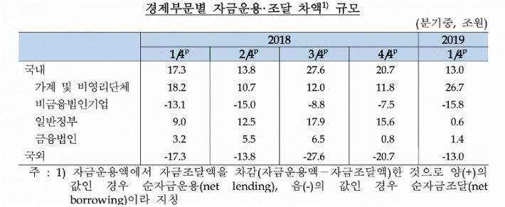 한국은행이 10일 발표한 '2019년 1/4분기중 자금순환(잠정)'에 따르면 올해 1분기 '가계 및 비영리단체'의 순자금운용 규모는 26조7000억원으로 전년동기(18조2000억원)에 비해 확대됐다.