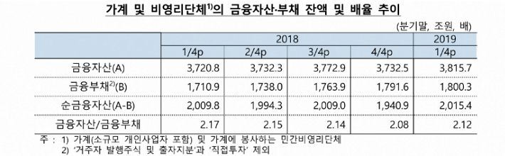 한편 1분기말 현재 국내 비금융부문의 순금융자산은 2748조원(금융자산 8262조2000억원-금융부채 5514조2000억원)으로 전분기말보다 120조1000억원 증가했다. 금융부채 대비 금융자산 배율은 1.50배로 전분기말(1.49배) 대비 소폭 상승했다.