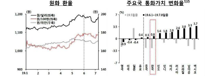 일본의 수출규제 공세 속에서도 환율이 안정적인 것으로 평가됐다. 국가부도지수로 통하는 CDS프리미엄이 하락하고, 외국인 증권투자 자금도 지속 유입을 이어갔다.