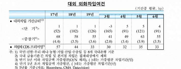 국내은행의 대외차입 가산금리는 5월 중 미리 조달이 이뤄진 데 따른 차입수요 감소에 힘입어 전월 대비 하락했다. 1년 미만 단기차입의 가산금리는 5월 말 5bp에서 지난달 말 4bp로, 1년 이상 장기 차입금은 같은 기간 63bp에서 55bp로 각각 낮아졌다.