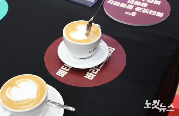 10일 서울 서대문구청에서 열린 제8회 메타넷과 함께하는 장애인 바리스타대회에서 심사위원이 참가자가 만든 라떼아트를 평가하고 있다.