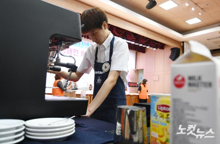 10일 서울 서대문구청에서 열린 제8회 메타넷과 함께하는 장애인 바리스타대회에서 한 참가자 라떼아트를 만들고 있다.
