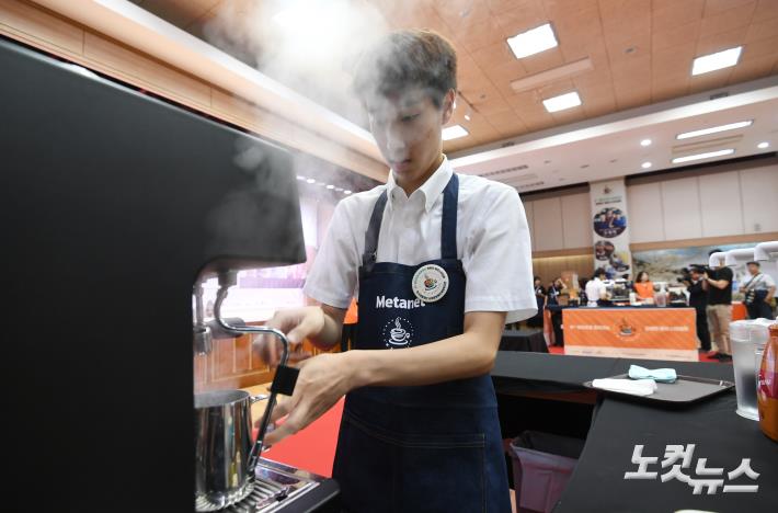 10일 서울 서대문구청에서 열린 제8회 메타넷과 함께하는 장애인 바리스타대회에서 한 참가자 라떼아트를 만들고 있다.