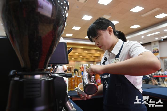 10일 서울 서대문구청에서 열린 제8회 메타넷과 함께하는 장애인 바리스타대회에서 한 참가자 라떼아트를 만들고 있다.
