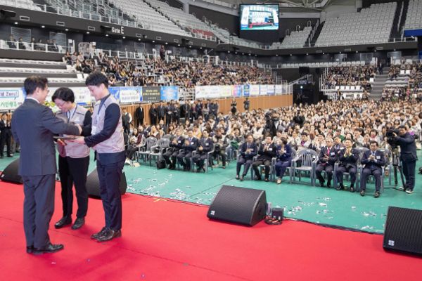 지난 3월 8일 오후 서수원 칠보체육관에서 열린 ‘체납관리단 연합 출범식’에서 체납관리단 대표 2명이 낭독한 결의문을 이재명 경기도지사가에게 전달하고 있다.(사진=경기도 제공)