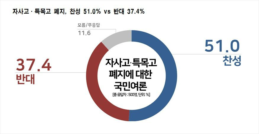 ◆ 이택수> 저희가 지난 금요일 전국 19세 이상 성인 9215명 접촉을 해서 최종 500명이 응답을 완료했습니다. 5.4%의 응답률, 무선 전화 면접 및 유무선 자동 응답 혼용 방식이었습니다. 표본 오차는 95% 신뢰수준에서 ±4.4%포인트였는데요. 질문은 다음과 같았습니다. 최근 조희연 서울교육감은 자사고와 특목고 폐지를 공론화로 결정하자고 제안했는데요. 선생님께서는 자사고와 특목고 폐지 찬성하십니까 아니면 반대하십니까? 이렇게 물었습니다.