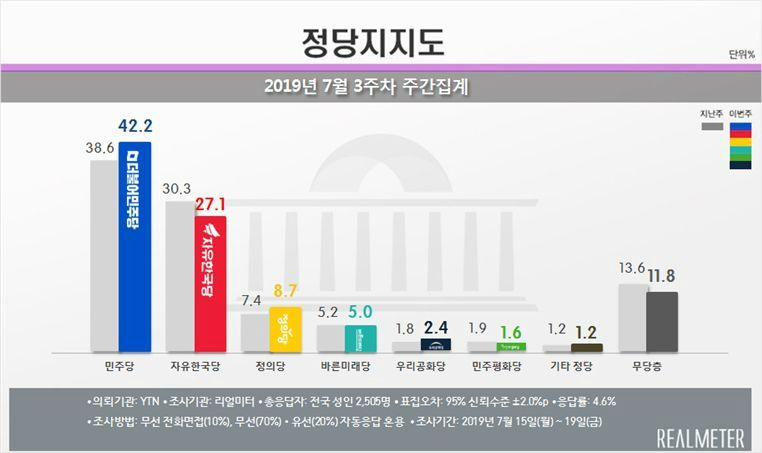 ◇ 김현정> 정당 지지율은 제가 빠르게 읽을게요. 민주당 42.2, 한국당 27.1, 정의당 8.7, 바른미래당 5.0, 우리공화당 2.4, 민주평화당 1.6을 기록했습니다. 민주당이 3.6%포인트 올랐고 한국당은 3.2%포인트 내려갔습니다. 이것도 역시 같은 이유라고 짐작이 되네요. 여기까지 이번 주 여론 빠르게 훑어봤네요. 이택수 대표 수고하셨고 잠시 후에 댓꿀쇼에서.