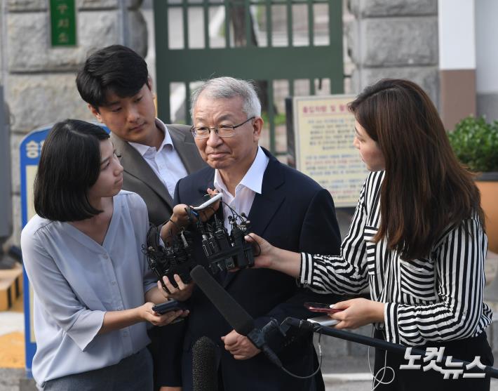사법행정권을 남용한 혐의로 구속된 양승태 전 대법원장이 22일 오후 경기도 의왕시 서울구치소에서 보석으로 풀려나며 취재진의 질문을 받고 있다.