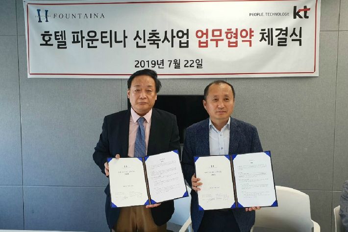 호텔 파운티나는 신축 호텔에 kt의 정보통신 기술을 융합한 인공지능(AI) 호텔 신규 서비스를 구축하기 위해 협약을 체결했다.