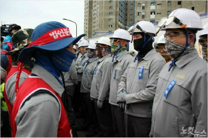 현대중공업 노사 양측 인원이 울산 동구 한마음회관 인근 도로에서 대치하고 있다. (사진=이상록 기자/자료사진)