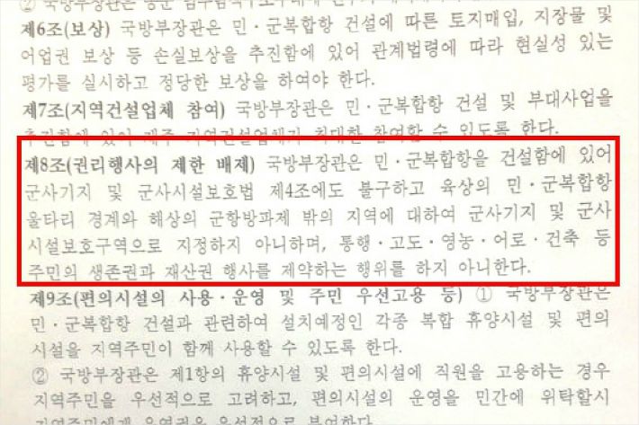 '국방부장관은 민군복합항을 건설함에 있어 군사기지 및 군사시설보호법 제4조에도 불구하고 육상의 민군복합항 울타리 경계와 해상의 군항방파제 밖의 지역에 대하여 군사기지 및 군사시설보호구역으로 지정하지 아니하며, 통행.고도.영농.어로.건축 등 주민의 생존권과 재산권 행사를 제약하는 행위를 하지 아니한다' 고 작성했습니다.