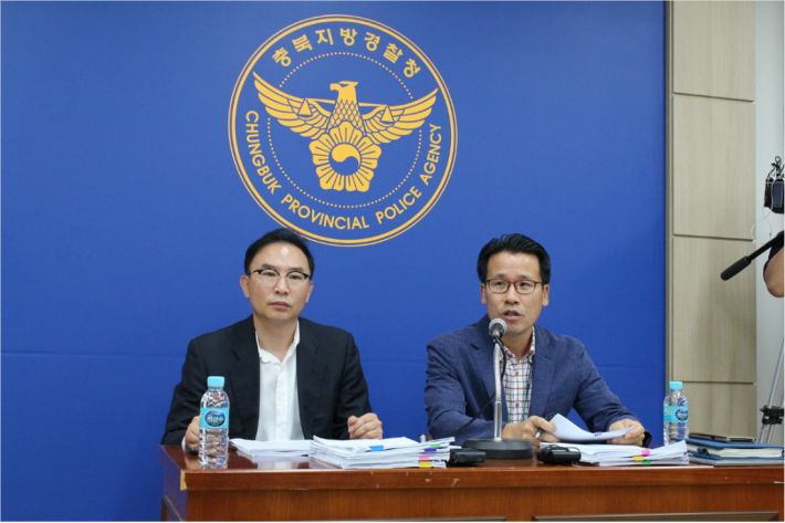 변재철(오른쪽) 충북지방경찰청 강력계장과 차상학 청주상당경찰서 형사과장이 24일 브리핑을 통해 '고유정 의붓아들 사망 사건'을 둘러싼 각종 의혹에 대해 설명하고 있다. (사진=최범규 기자)