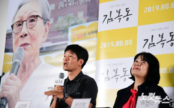 미디어몽구 김정환 씨(왼쪽)가 4일 오후 서울 중구 메가박스 동대문점에서 열린 영화 '김복동' 언론시사회에 참석해 취재진의 질문에 답하고 있다.