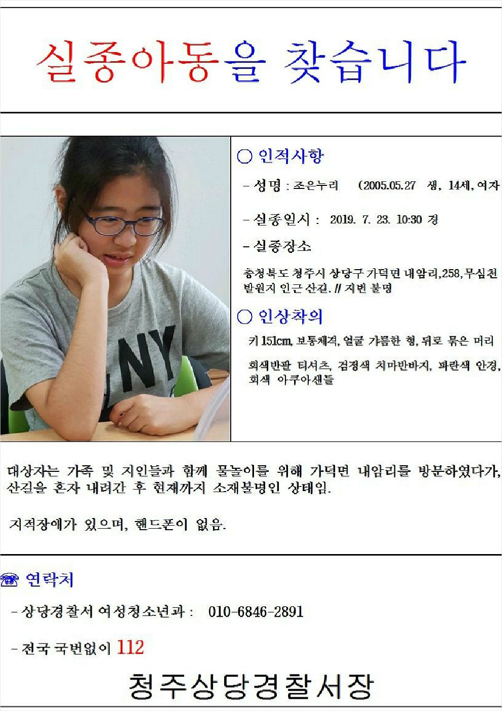 지난 23일 오전 10시 30분쯤 지적장애 A(14)양이 실종됐다는 신고가 접수됐다.