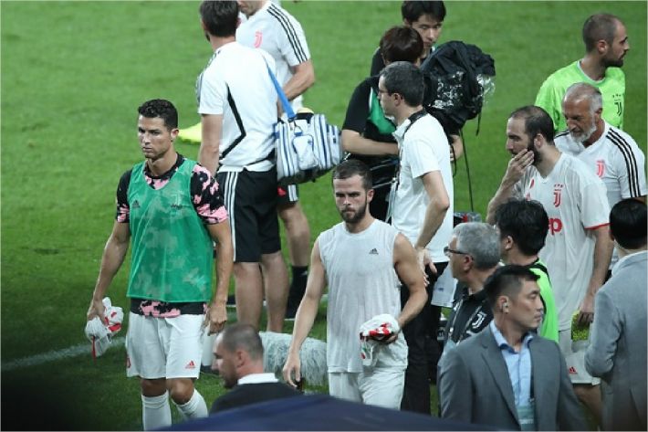 6일 오후 서울 마포구 성산동 서울월드컵경기장에서 열리는 하나원큐 팀 K리그와 유벤투스 FC의 친선경기. 경기 내내 벤치에 앉아있던 호날두가 종료 뒤 경기장을 떠나고 있다.ⓒ 연합뉴스