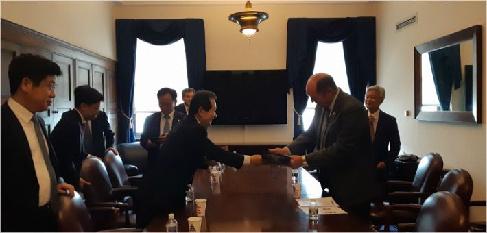 민주당 소속 정세균 방미의원단 단장이 25일(현지시간) 미국 워싱턴DC 의회의사당에서 공화당 테드 요호 하원 의원과 면담한 뒤 기념품을 전달하고 있다. (사진=연합뉴스)