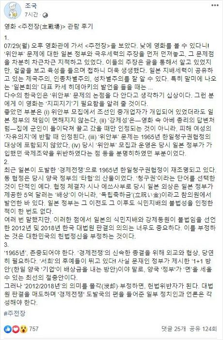 청와대 조국 전 민정수석이 페이스북에 일본 극우세력의 실체를 다룬 영화 '주전장'의 감상평을 올리며 '페북 정치', '페북 항일전'을 이어가고 있다.