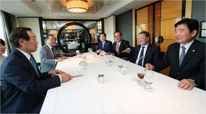 여야 의원 10명으로 꾸려진 방일단은 이날 일본 도쿄(東京) 도착 직후 한 호텔에서 첫 일정으로 자민당 누카가 후쿠시로(額賀福志郞) 일한의원연맹 회장 등 일본 의원 10명과 오찬 간담회를 가졌다. 오찬 간담회는 비공개로 약 1시간 50분 동안 이어졌다.