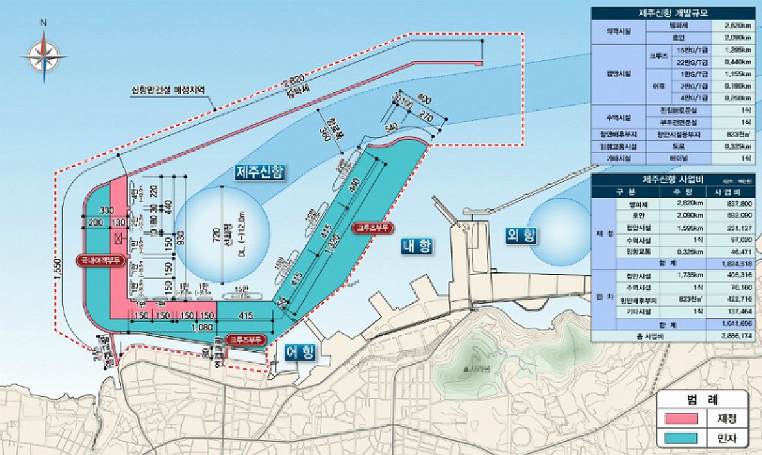 제주시 삼도동, 건입동, 용담동 일대에 외곽시설(방파제 2.82km, 호안 2.09km)과 접안시설(크루즈 4선석, 여객 9선석), 항만 배후부지(823천㎡)와 도로(0.325km) 등을 확충한다.