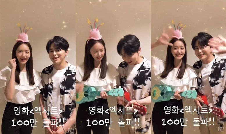'엑시트' 100만 돌파를 맞아, 영화 속 '짠내 콤비' 조정석과 임윤아는 감사 인사 영상을 전했다. 두 사람은 관객들에게 고마움을 표한 후, 우쿨렐레를 들고 노래를 불렀다. 극중 S.O.S. 신호를 나타내는 '따따따'에 멜로디를 붙여 웃음을 선사했다.