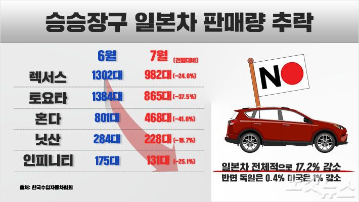 ◇ '고속질주' 일본차… 불매운동에 급정거6일 한국수입자동차협회에 따르면 한국 시장에서 승승장구하던 일본차의 7월 판매량이 급감했다. 도요타와 렉서스, 혼다, 닛산, 인피니티 등 모든 브랜드의 판매량이 6월과 비교해 두 자릿수 이상 줄었다.