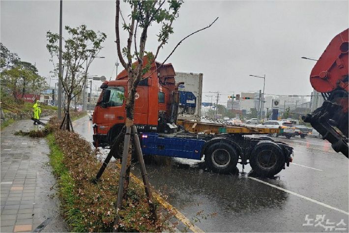 6일 오후 부산 남구의 한 도로에서 트레일러가 빗길에 미끄러져 가로수와 가로등을 들이 받는 사고가 발생했다. (사진=부산경찰청 제공)