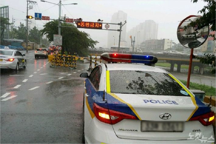 6일 오후 상습침수구역인 연안교와 세병교 하부도로 통행이 통제됐다. (사진=부산경찰청 제공)
